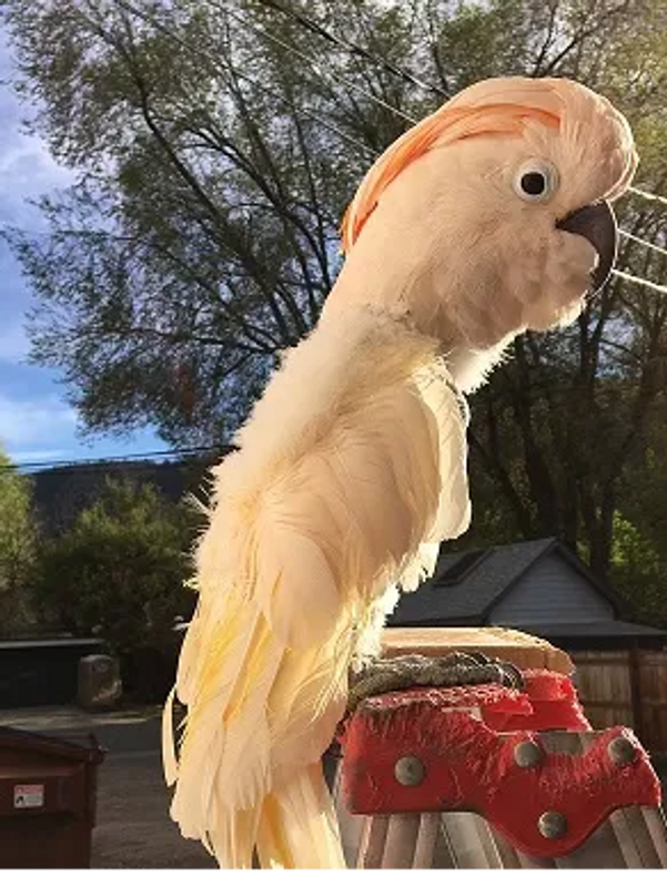 JJ is a 55-year-old Moluccan Cockatoo that Darwin got in Scottsdale Arizona when he was three years old. He likes to say that JJ "picked" him to be his best friend and that he should hopefully live to be about 90 years old. JJ likes to keep a watchful eye on Darwin and spends his days "recycling" old tape measurers, going on errands around the town and munching on unsalted organic cashews.